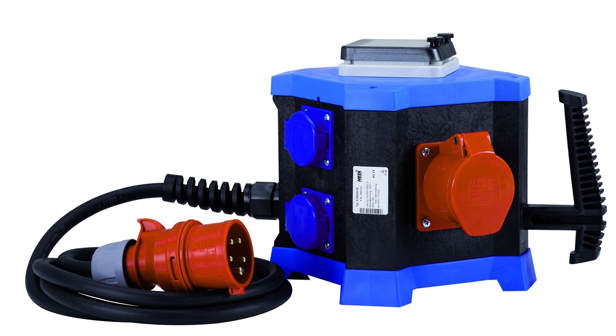 Steckdosenverteiler aus glasfaserverstärktem Kunststoff, Ober- und Unterseite mit vier Standfüßen aus Gummimaterial, mit großzügigem Tragegriff für den mobilen Einsatz, mit ca. 2,5 m Neopren-Gummi-Leitung H07RN-F 5G4,0 und CEE-Stecker 400 V / 5x32 A; Ausgänge: 2 CEE-Steckdosen 5x 16 A und 4 Schuko-Steckdosen. Eingebaute Sicherungen: 1xB 16A, 1x 3xB 16 A. Für den ständigen Einsatz im Freien.Technische Daten: