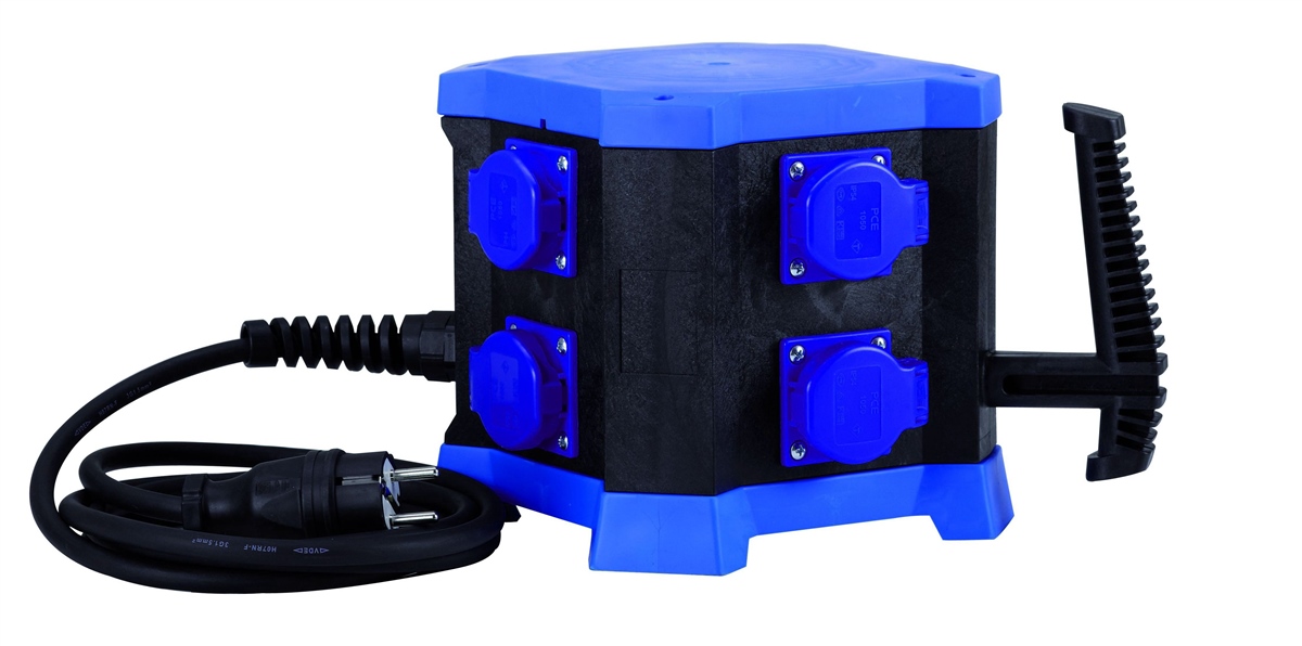 Steckdosenverteiler aus glasfaserverstärktem Kunststoff, Ober- und Unterseite mit vier Standfüßen aus Gummimaterial, mit großzügigem Tragegriff für den mobilen Einsatz, mit ca. 2,5 m Neopren-Gummi-Leitung H07RN-F 3G2,5 und Schuko-Stecker 250 V / 16 A; Ausgänge: 8 Schuko-Steckdosen. Für den ständigen Einsatz im Freien.Technische Daten: