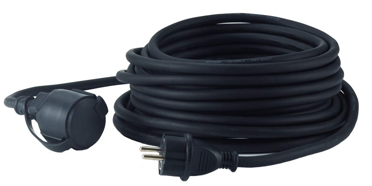 Verlängerungsleitung, 50 m Neopren-Gummi-Leitung H07RN-F 3G2,5, schwarz, mit spritzwassergeschütztem Schuko-Stecker und -Kupplung. Schutzart IP 44. Für den ständigen Einsatz im Freien.Technische Daten: