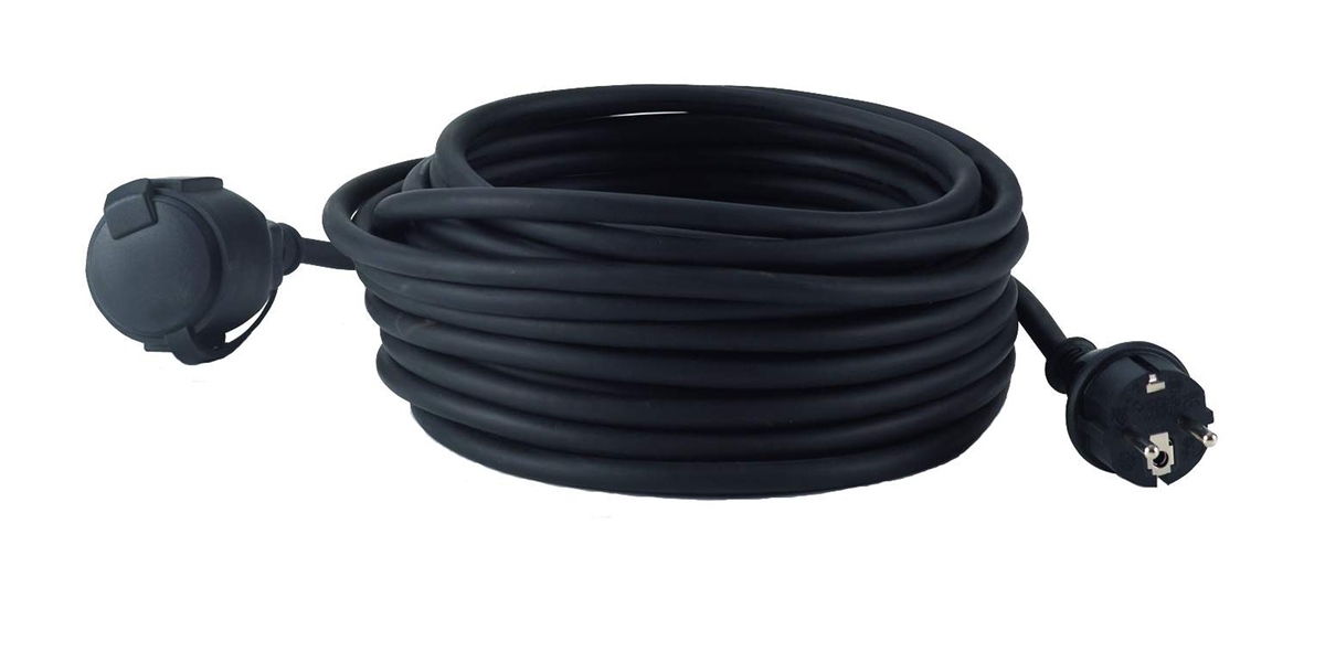 Verlängerungsleitung, 5 m Gummi-Leitung H05RR-F 3G1,5, schwarz, mit spritzwassergeschütztem Schuko-Stecker und -Kupplung. Schutzart IP 44. Zur kurzfristigen Verwendung im FreienTechnische Daten: