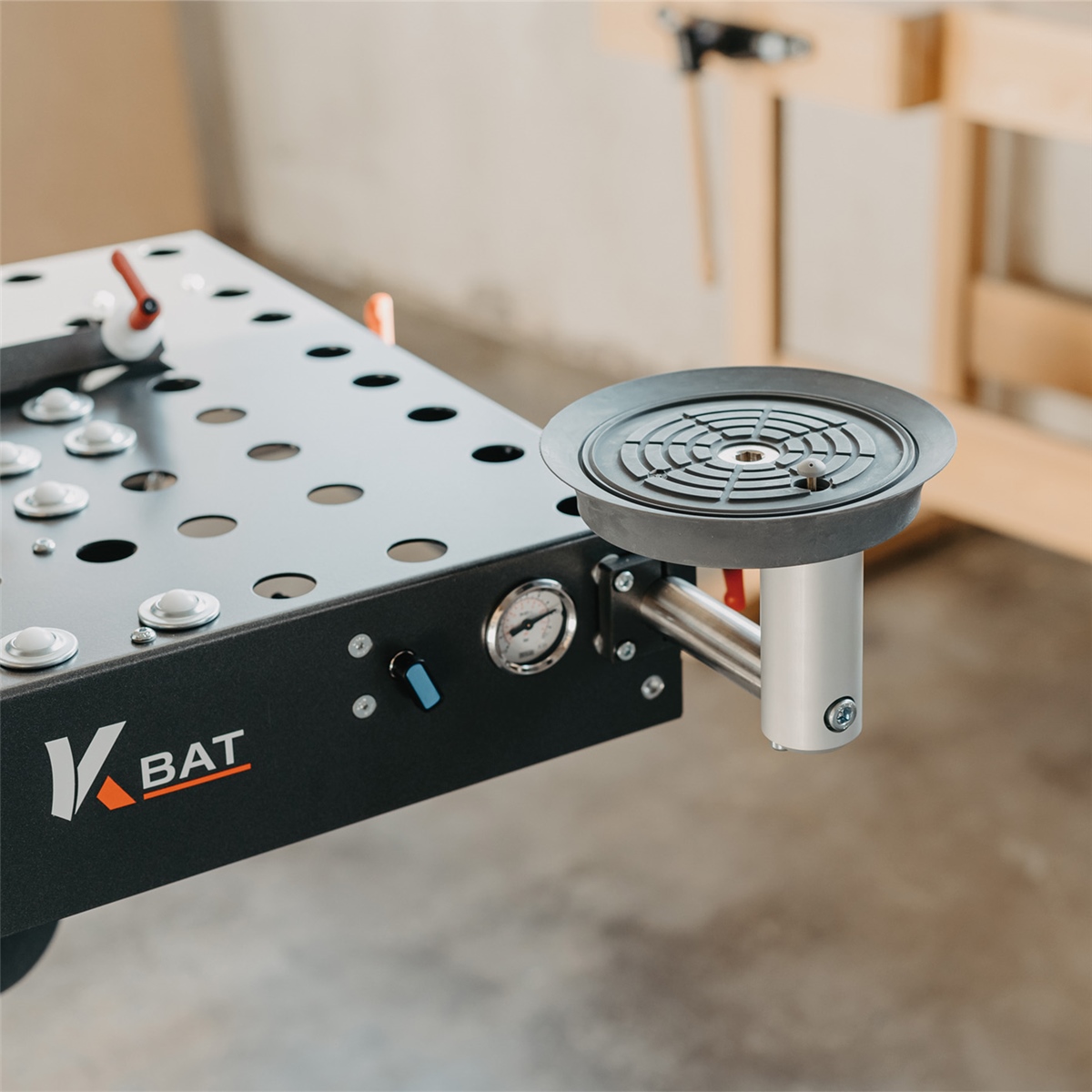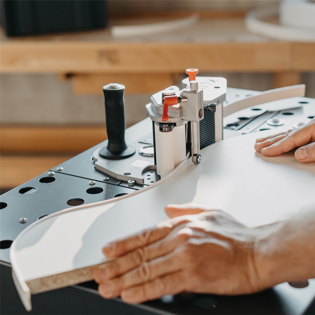 - SCHWENKBARE VAKUUMPLATTE - Zur sicheren Nachbearbeitung der Kante kann das Werkstück mit der Vakuumplatte fixiert werden. Ein Tastventil schaltet diese bei nichtgebrauch ab.