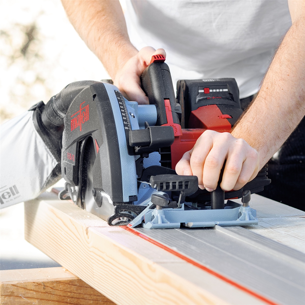 - GEHRUNGSSCHNITTE - Perfekte Schnittqualität selbst bei Schrägschnitten: Die Handkreissäge ist optimiert für den Einsatz auf der Führungsschiene. Dabei sägt sie immer exakt an der Gummilippe.