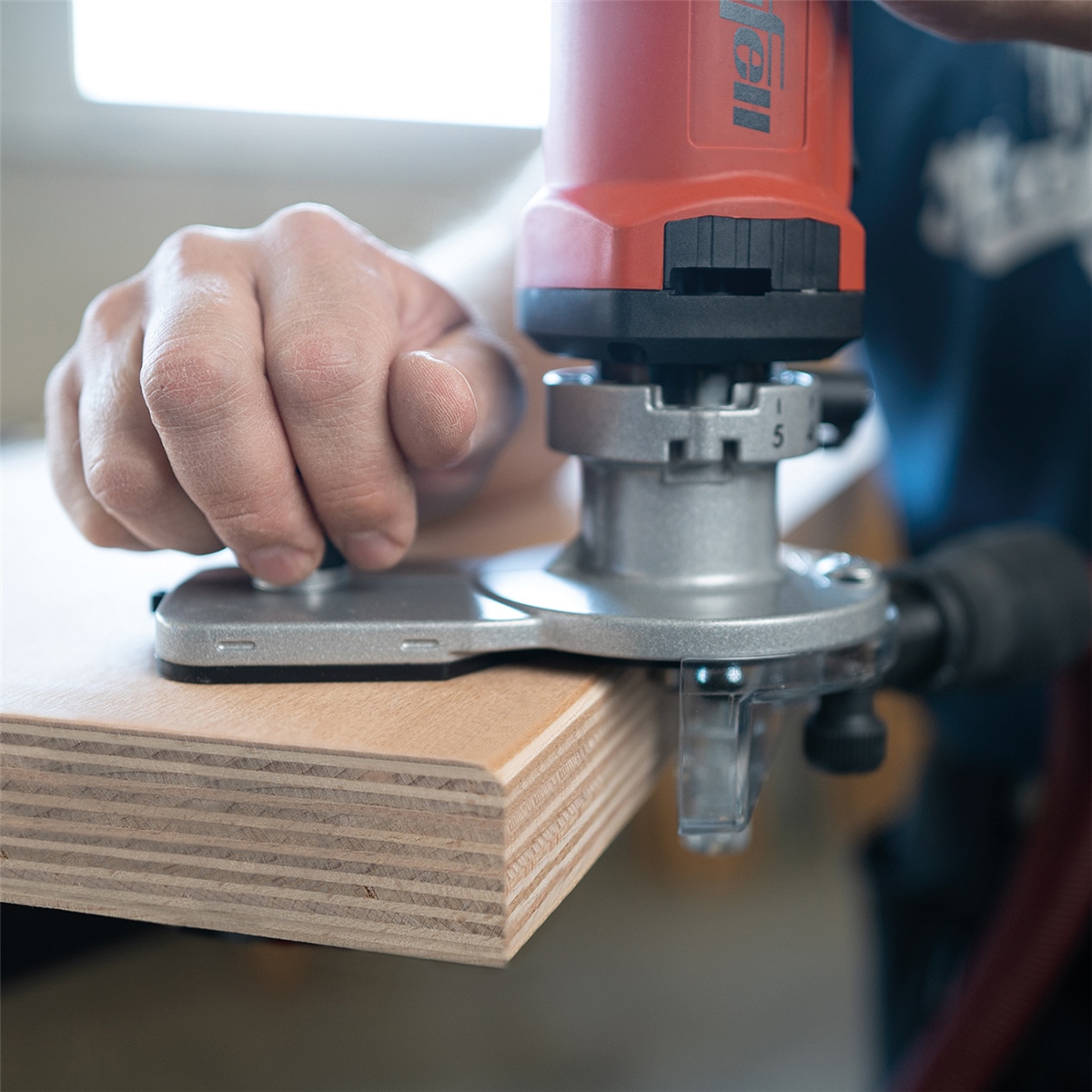 - Stufenlose Feineinstellung der Frästiefe über Gewindering mit 1/10 mm Skala.
