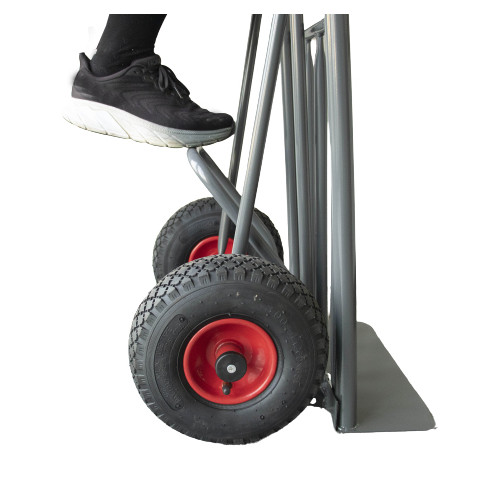 Die Sackkarre verfügt über einen robusten Rahmen aus vollverschweißten Rohren, eine Easy-Tip-Funktion, die die Belastung um 50 % reduziert und starke Lufträder.