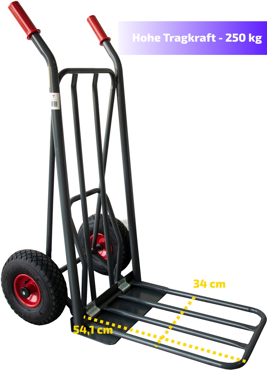 Die Sackkarre ist mit einer Stützplatte und einem Klapprahmen ausgestattet und hat eine Tragfähigkeit von 250 kg.