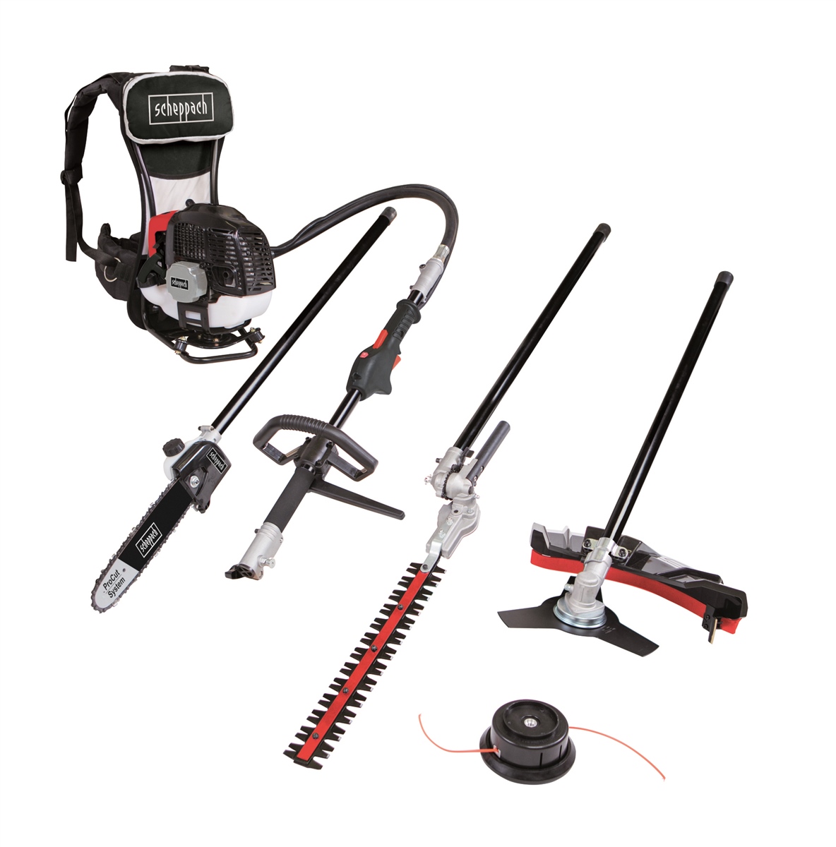 Scheppach 4in1 Benzin Gartenpflegeset Heckenschere Trimmer Rucksack MFH5300-4BP
