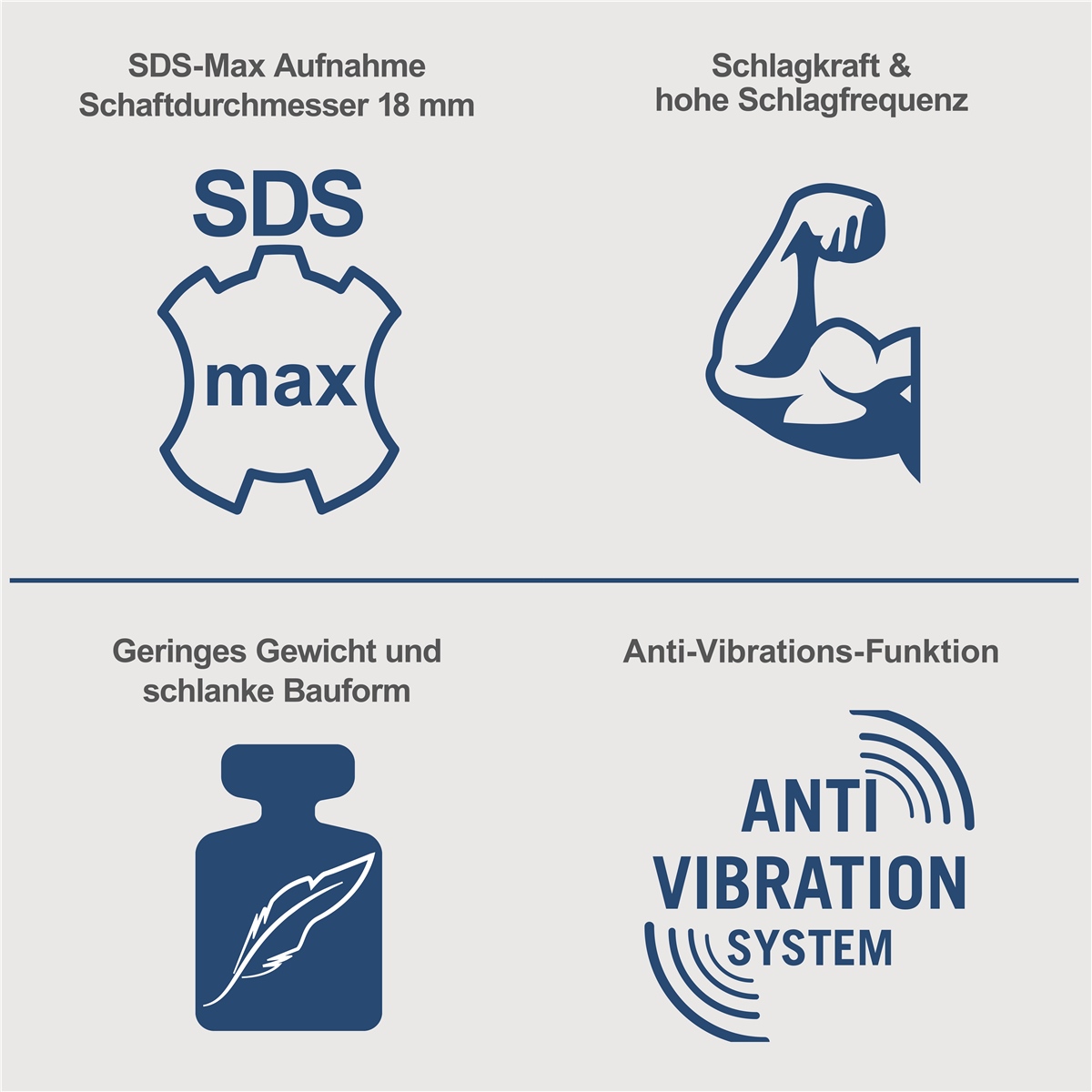 - Einfacher und schneller Werkzeugwechsel über SDS Max Bohrfutter