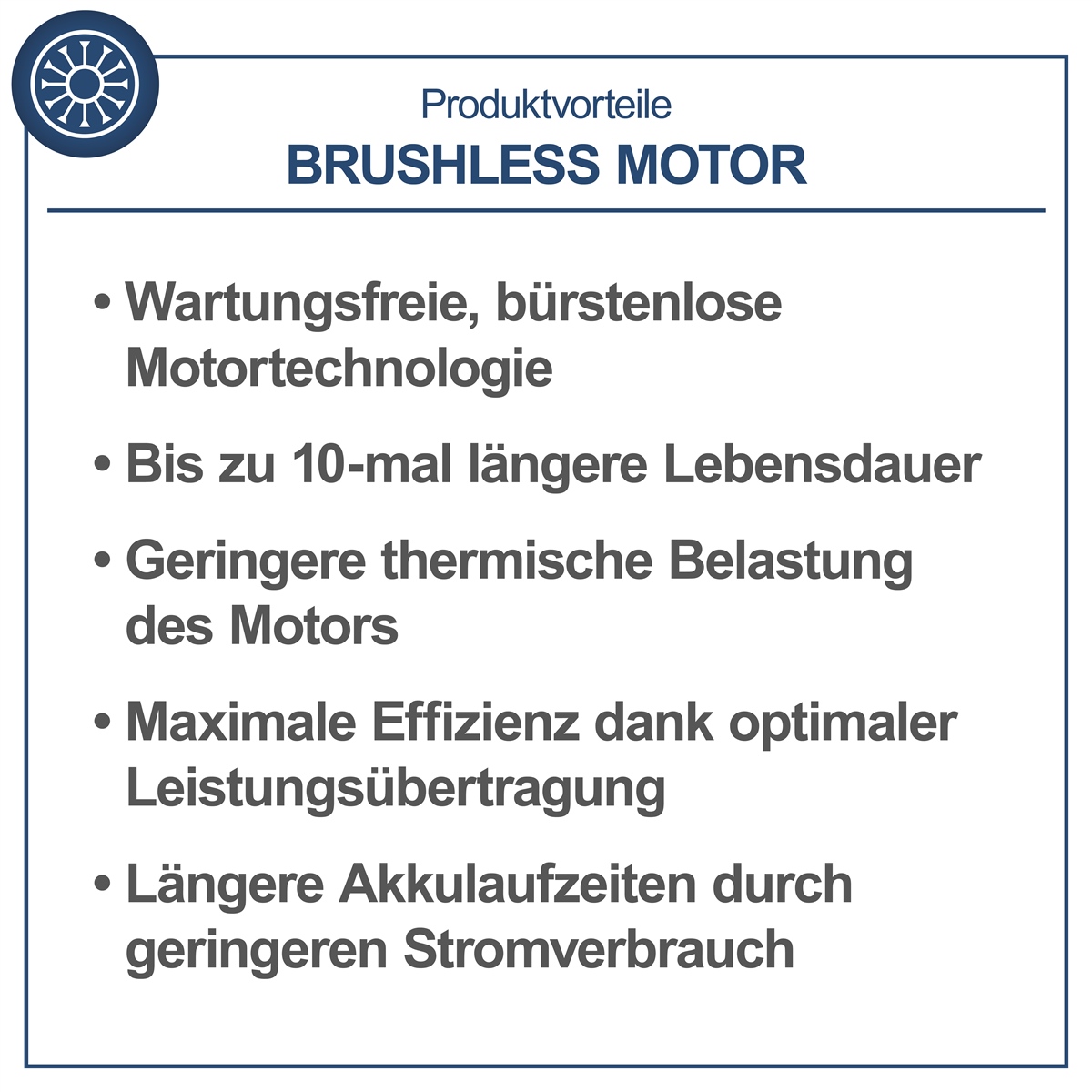 - Wartungsfreier, bürstenloser Motor (Brushless Motor) mit besonders hohem Wirkungsgrad, längerer Laufzeit, hoher Lebensdauer und geringem Verschleiß