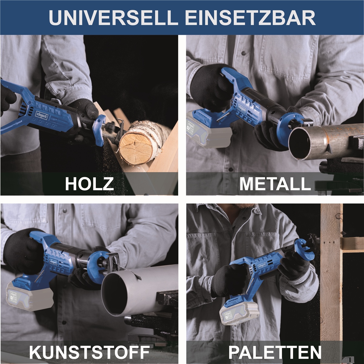 - Leistungsstarke Akku-Säbelsäge für Schnitte in Holz, Kunststoffe, NE-Metalle oder Baustoffe (unter Verwendung eines geeigneten Sägeblatts)