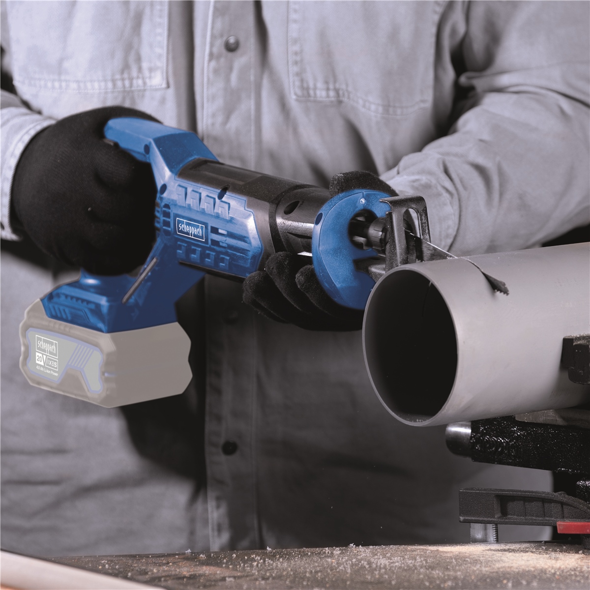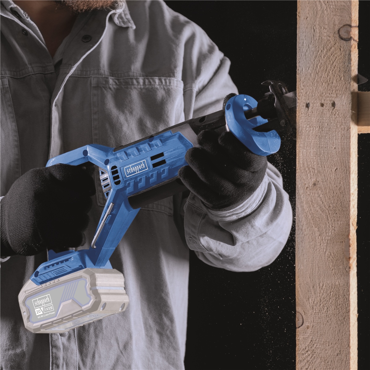 - Kabelloses Arbeiten mit der Scheppach IXES 20-Volt-Serie – alle Akkus und Ladegeräte aus der Systemreihe können mit der Akku-Säbelsäge kombiniert werden