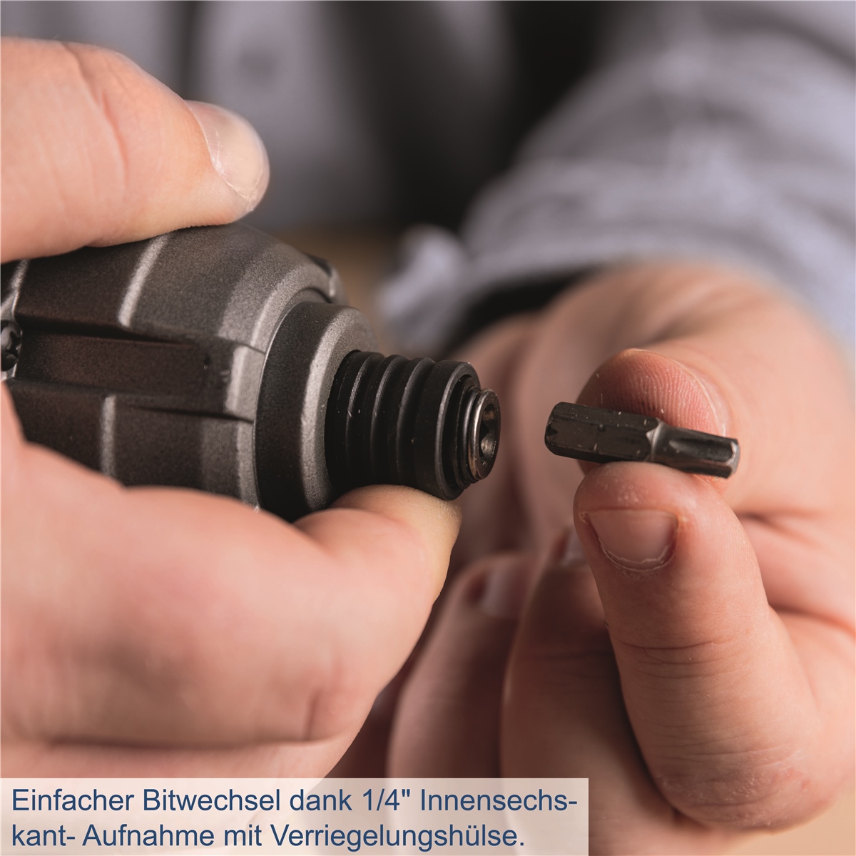 - Einfacher Bitwechsel dank ¼ Zoll Innensechskant-Aufnahme mit Verriegelungshülse