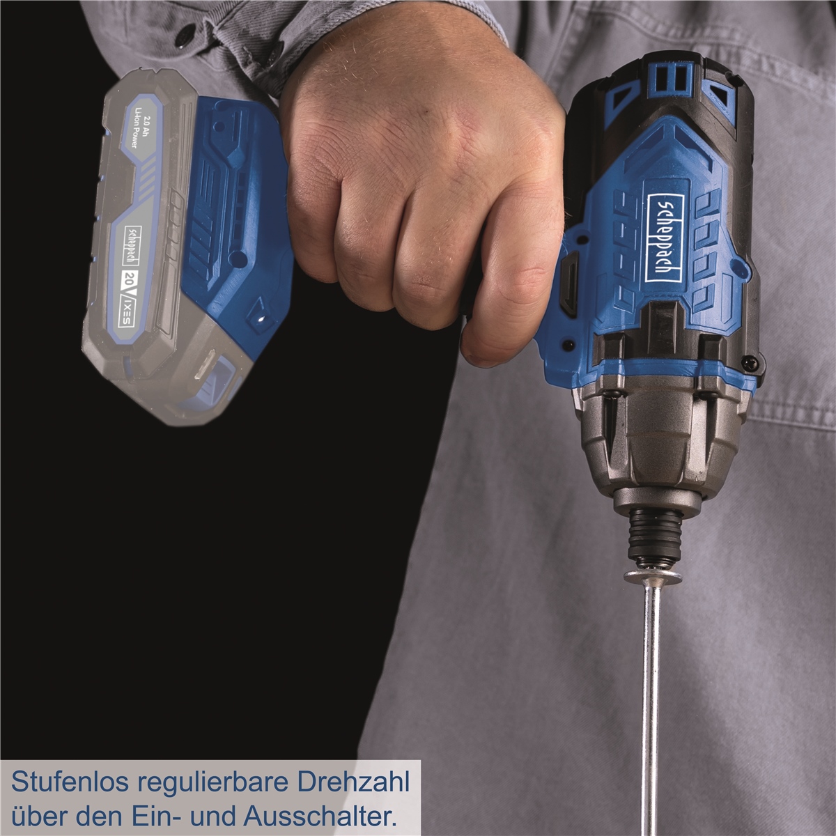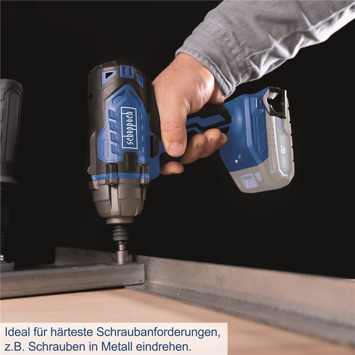- Kabelloses Arbeiten mit der Scheppach IXES 20-Volt-Serie – alle Akkus und Ladegeräte aus der Systemreihe können mit dem Akku-Schlagschrauber kombiniert werden