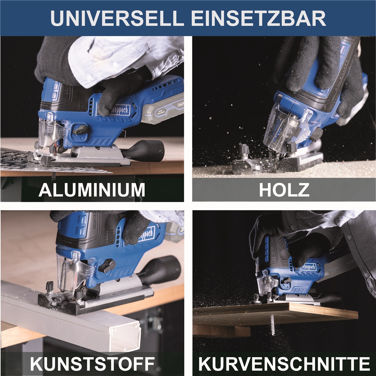 - Akku-Stichsäge für präzise Schnitte in verschiedenste Materialien wie Holz, Metall, Aluminium, Messing, Kunststoff, etc. (unter Verwendung eines geeigneten Sägeblatts)