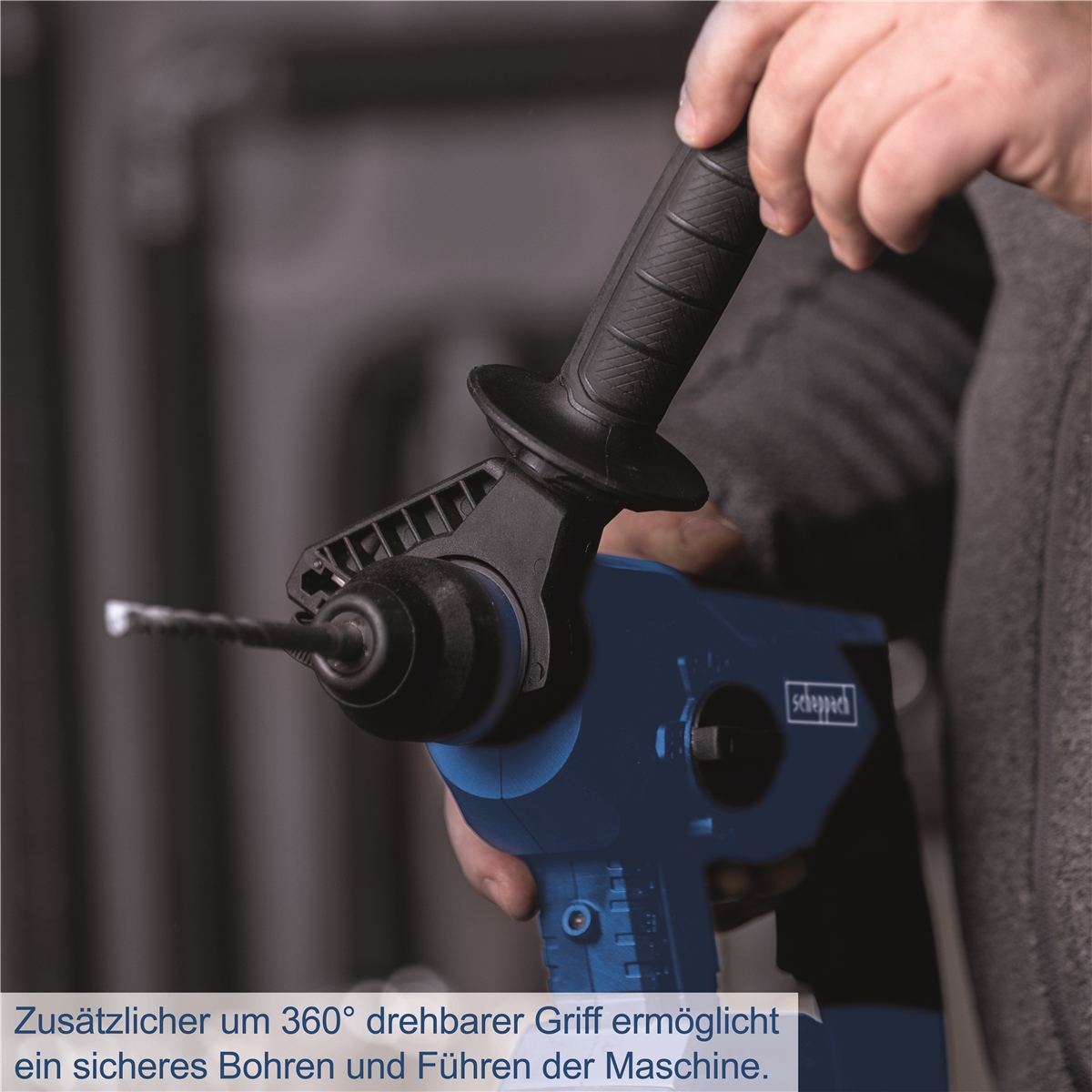 - Zusätzlicher um 360° drehbarer Griff ermöglicht ein sicheres Bohren und Führen der Maschine
