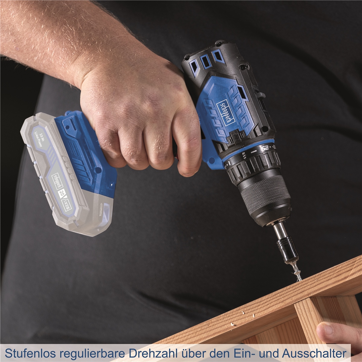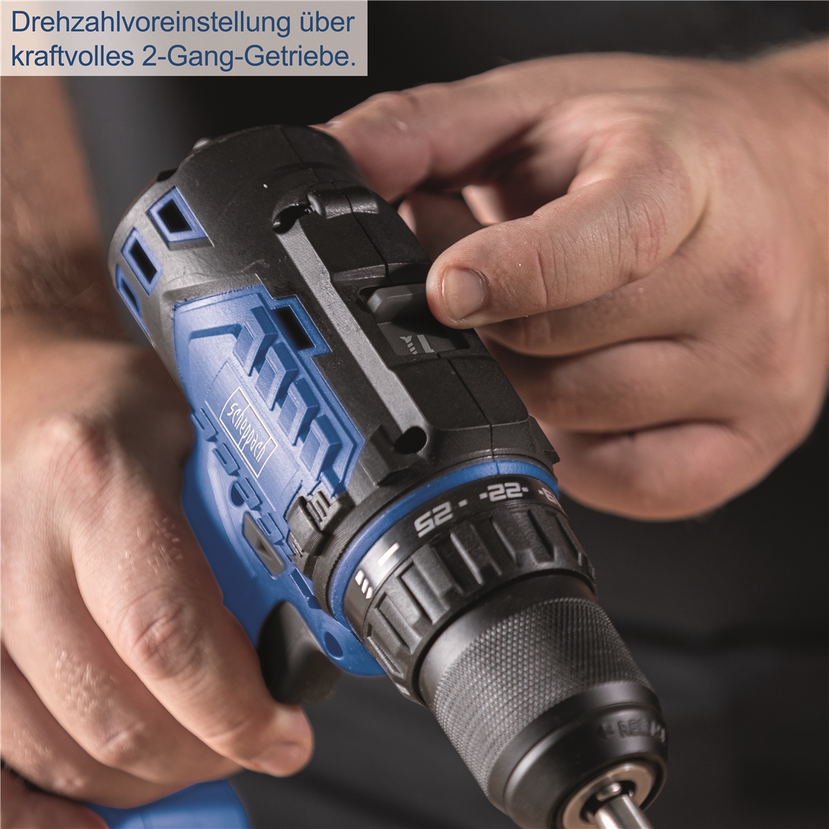 - Kabelloses Arbeiten mit der Scheppach IXES 20-Volt-Serie – alle Akkus und Ladegeräte aus der Systemreihe können mit dem Akku-Bohrschrauber kombiniert werden