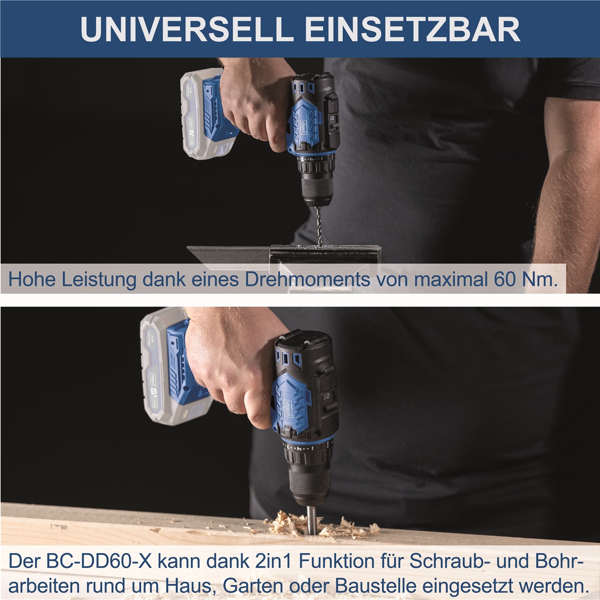 Der Scheppach Akku-Bohrschrauber BC-DD60-X ist mit einem Drehmoment von maximal 60 Nm ein praktischer Allrounder für den Einsatz rund um Haus, Garten, Baustelle oder den mobilen Gebrauch. Ausgerüstet mit einem leistungsstarken 2-Gang-Getriebe und einem robusten Schnellspannmetallbohrfutter mit einem Spannbereich von 1,5 – 13 mm ist der BC-DD60-X ideal zum kraftvollen Schrauben ausgelegt. Angetrieben wird der BC-DD60-X von einem kraftvollen bürstenlosen Motor. Dieser Brushless Motor sorgt für einen besonders hohen Wirkungsgrad, eine längere Laufzeit, eine hohe Lebensdauer und einen geringeren Verschleiß. Als Teil der Scheppach IXES 20-Volt-Serie können alle Akkus und Ladegeräte der Systemreihe mit dem Bohrschrauber kombiniert werden. Akku und Ladegerät sind separat erhältlich.