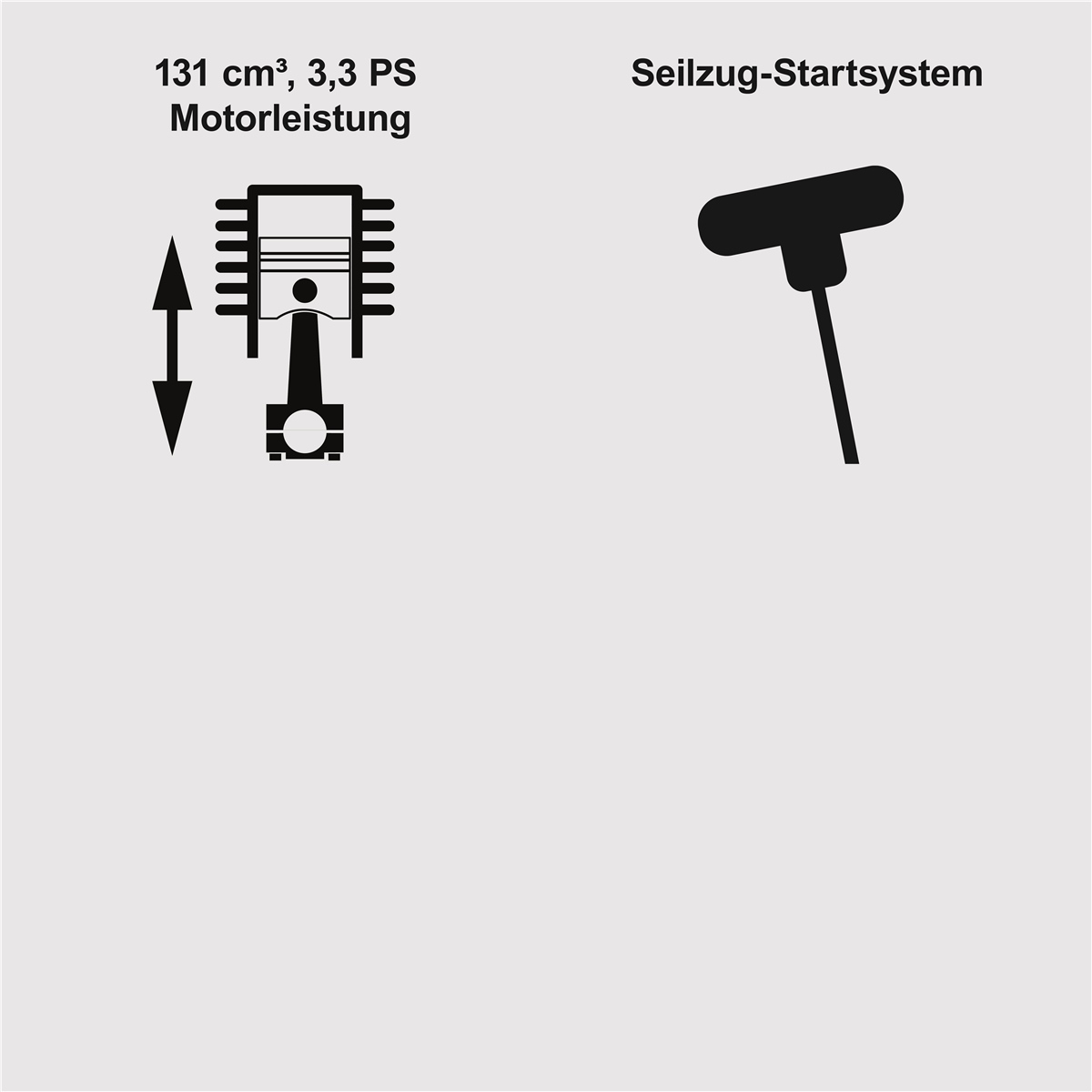 - Leistungsstarker 131 cm³ 4-Takt-Benzinmotor mit 3,3 PS / 2,4 kW