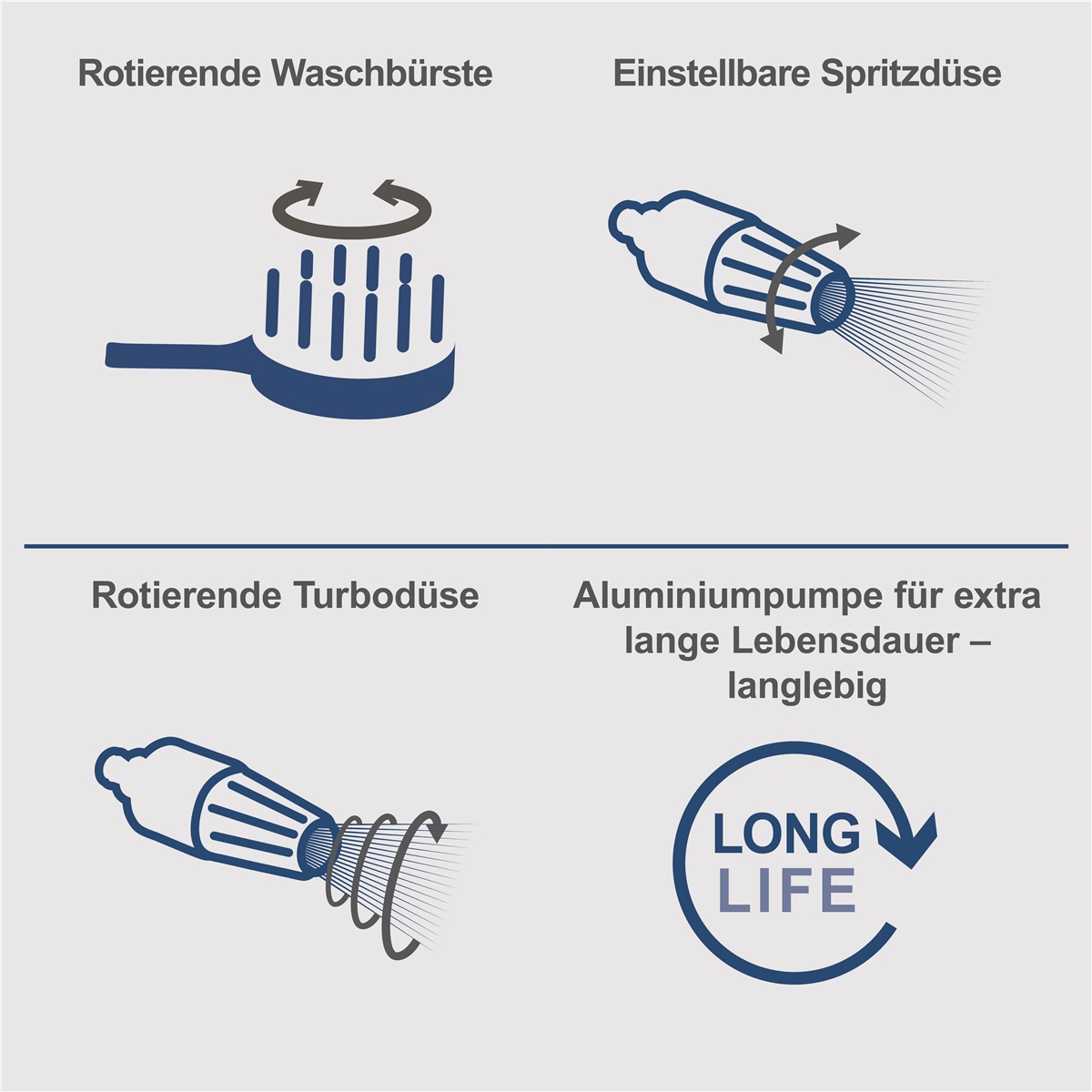 - Inklusive variabel einstellbarem Düsenelement mit Hochdruck- und Reinigungsmitteldüse, Turbodüse und rotierender Waschbürste