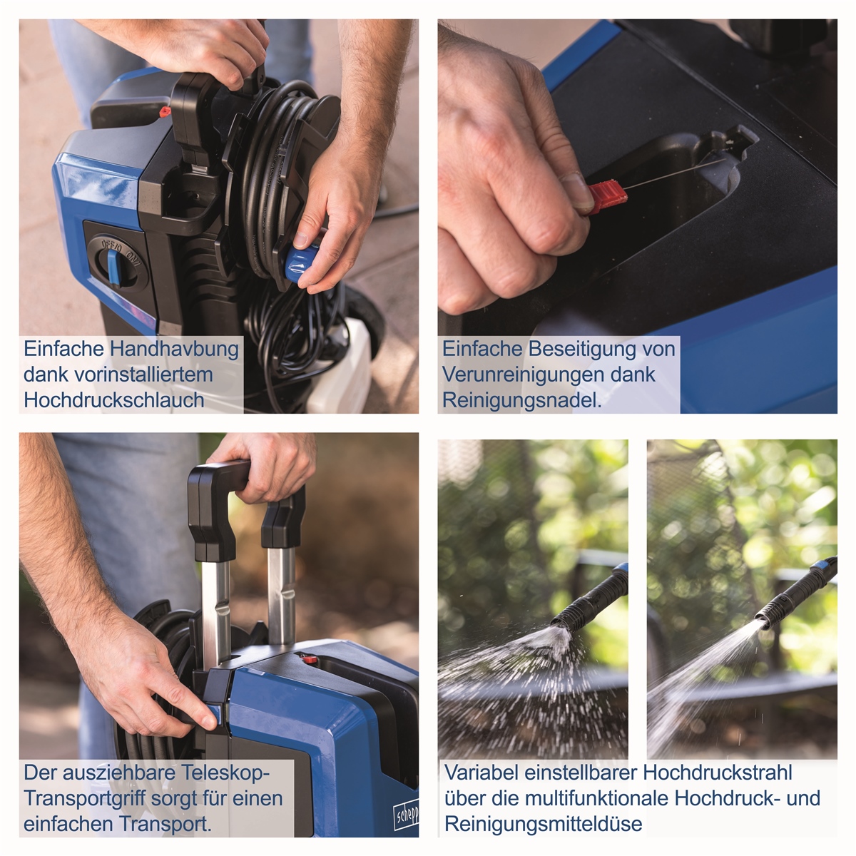 - Variabel einstellbarer Hochdruckstrahl über die multifunktionale Hochdruck- und Reinigungsmitteldüse