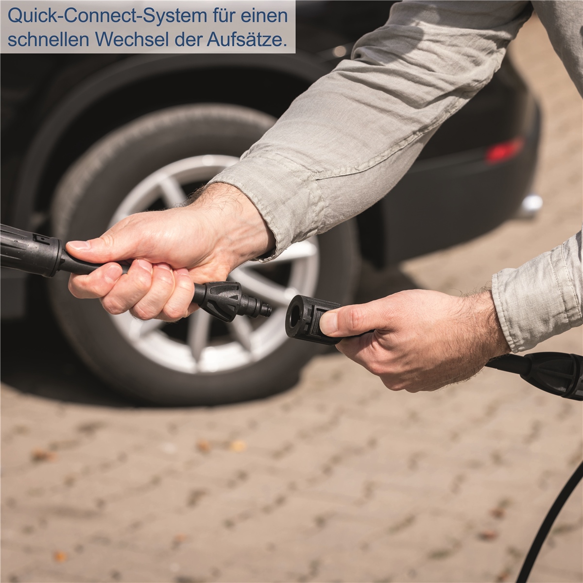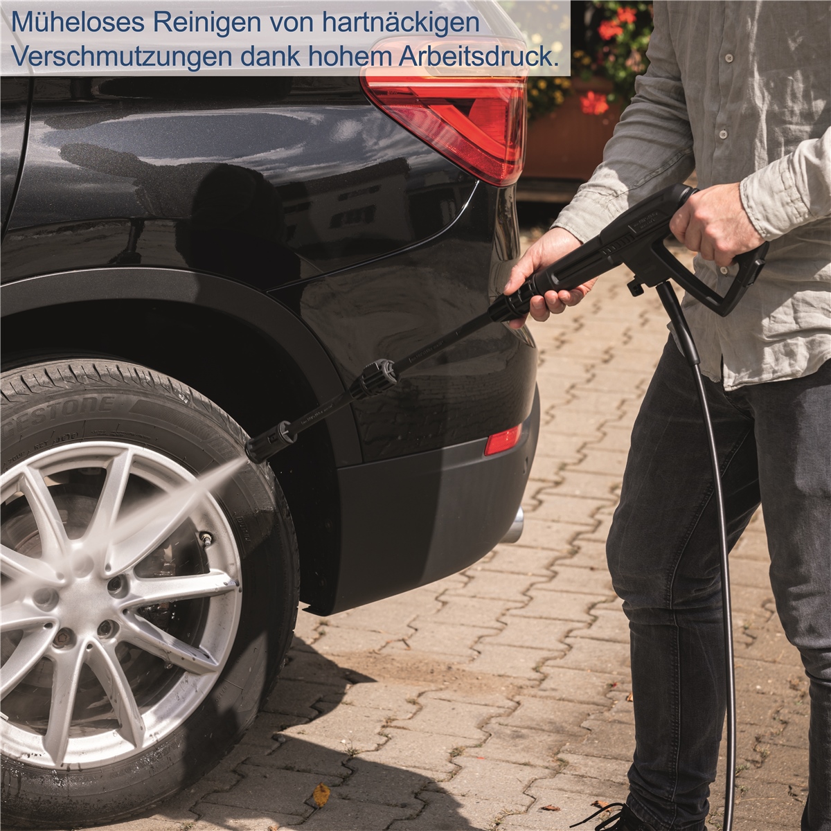 - Kräftiger 1400 W Motor mit 110 bar Maximaldruck und 80 bar Arbeitsdruck