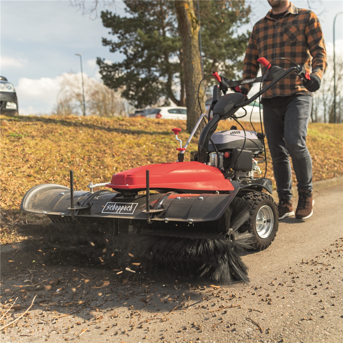 Die Scheppach Benzin Kehrmaschine SC2200PE inklusive Schneeschild und Sammelbehälter