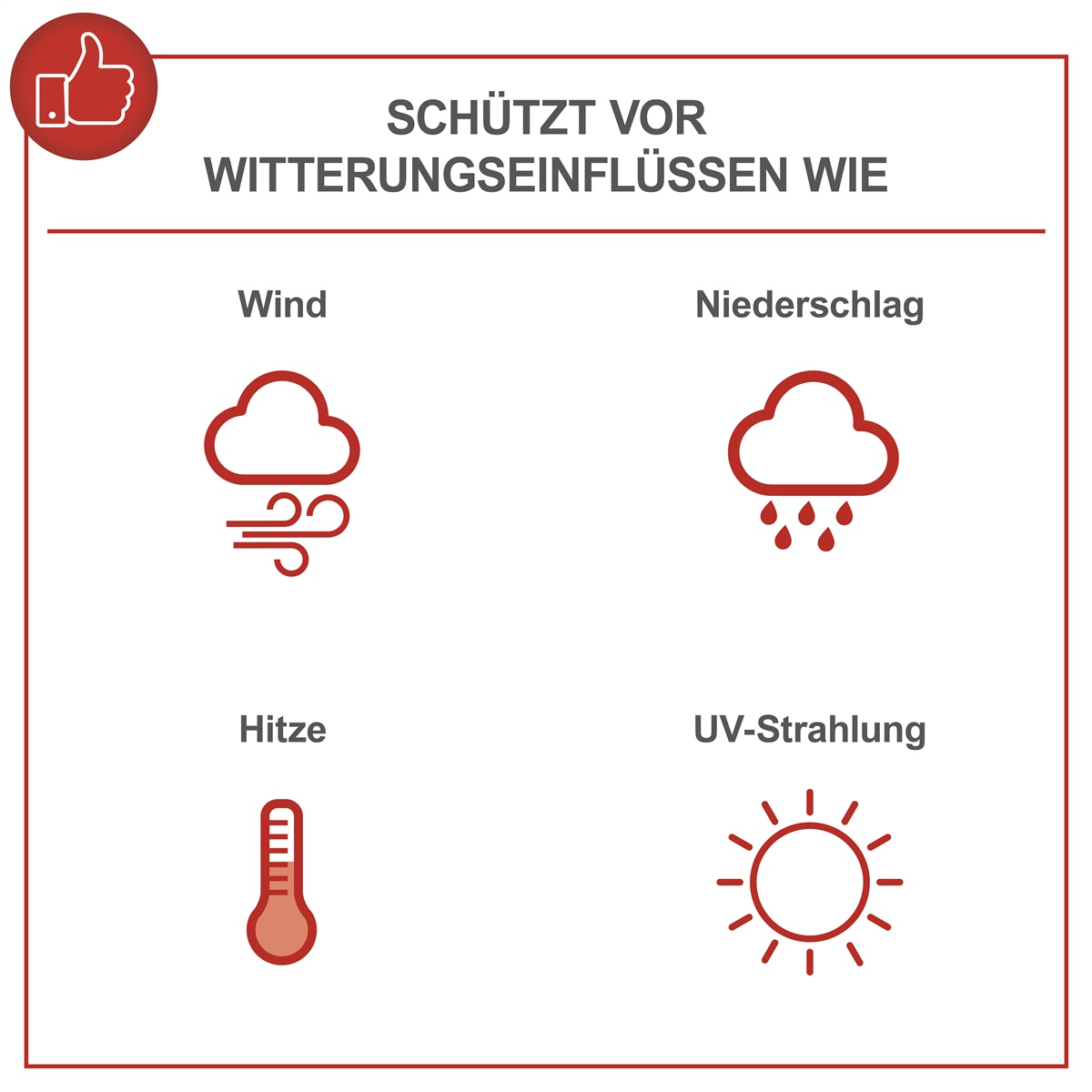 - Sorgt für zuverlässigen Schutz vor Regen, Wind, Hagel und Sonne