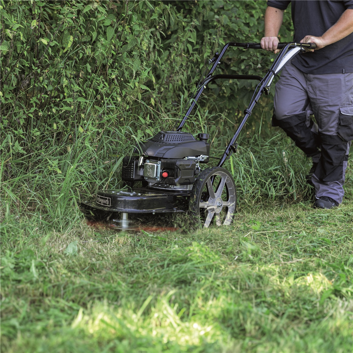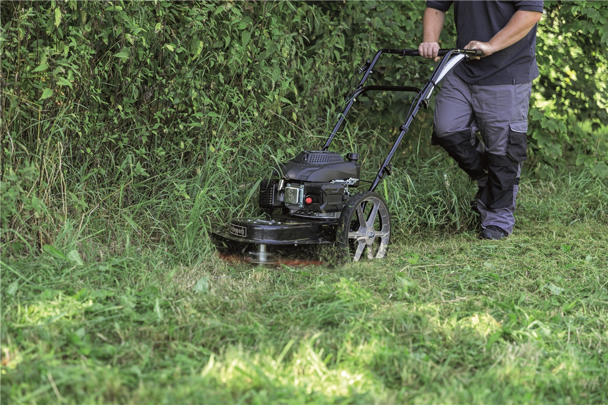 Der Scheppach Wiesenmäher HMP161-56B eignet sich ideal zum Mähen von unwegsamem Gelände mit hohem Gras, wie beispielsweise große Wiesenflächen, Weiden oder Koppeln. Mit dem kraftvollen 4,1 PS / 3 kW 4-Takt-Benzinmotor mit 161 cm³ verfügt der Wiesenmäher über eine Flächenleistung von bis zu 800 m2/h. Der 4 mm Vierkantdoppelfaden sorgt für ein besonders sauberes Schnittergebnis. Der integrierte Spritzschutz garantiert optimale Sicherheit während des Mähens. Die Schnitthöhe kann dabei stufenlos von 40 bis 95 mm eingestellt werden.