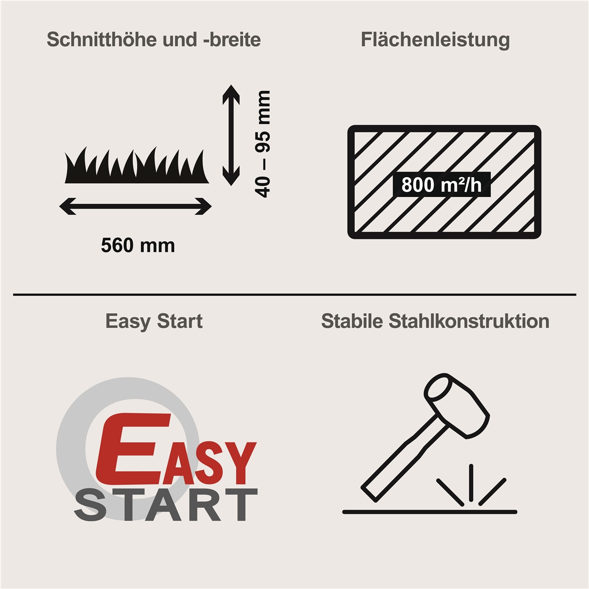 - Schnitthöhenverstellung: 40 – 95 mm