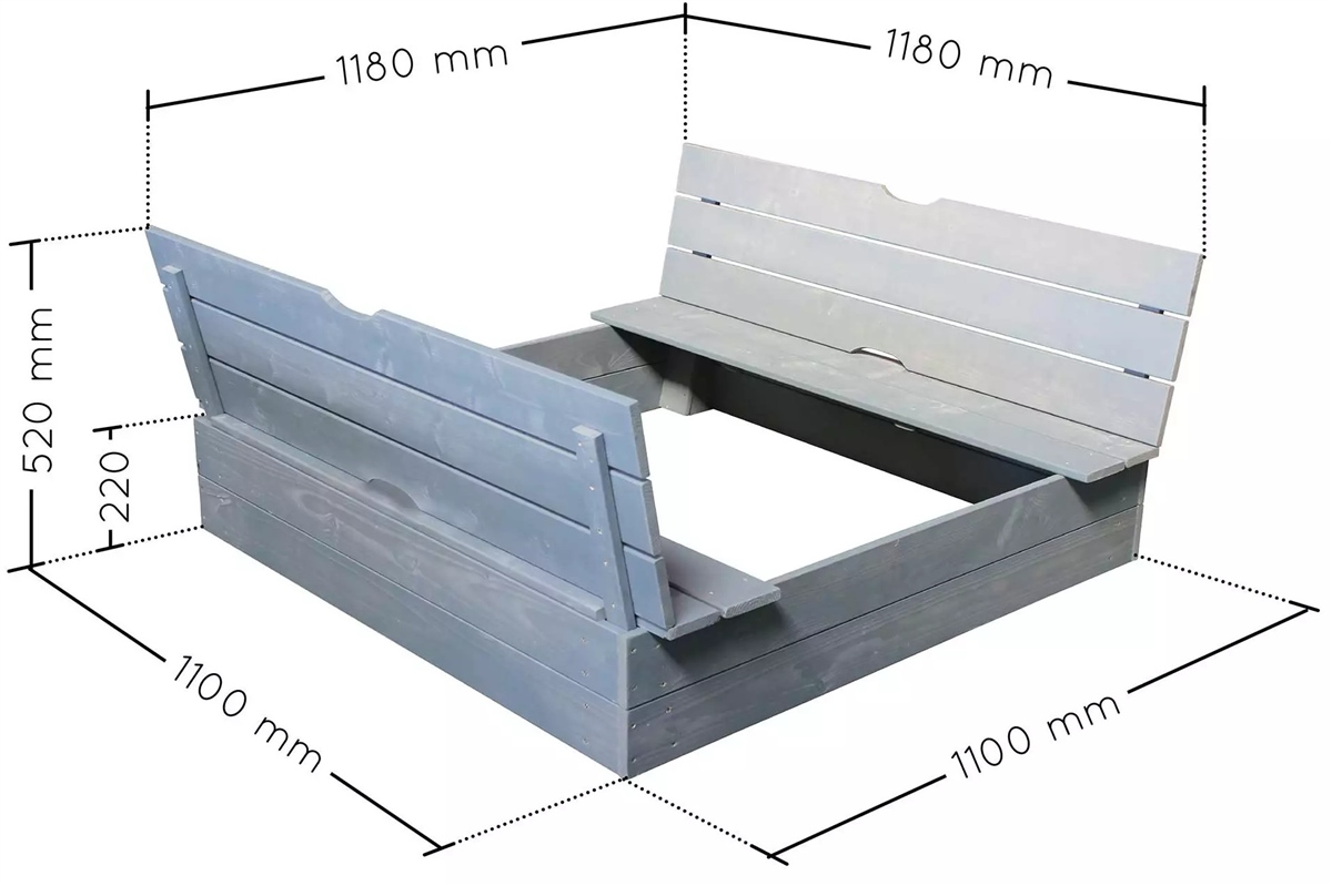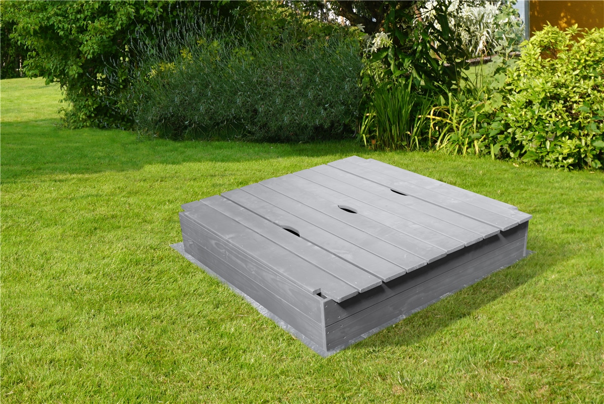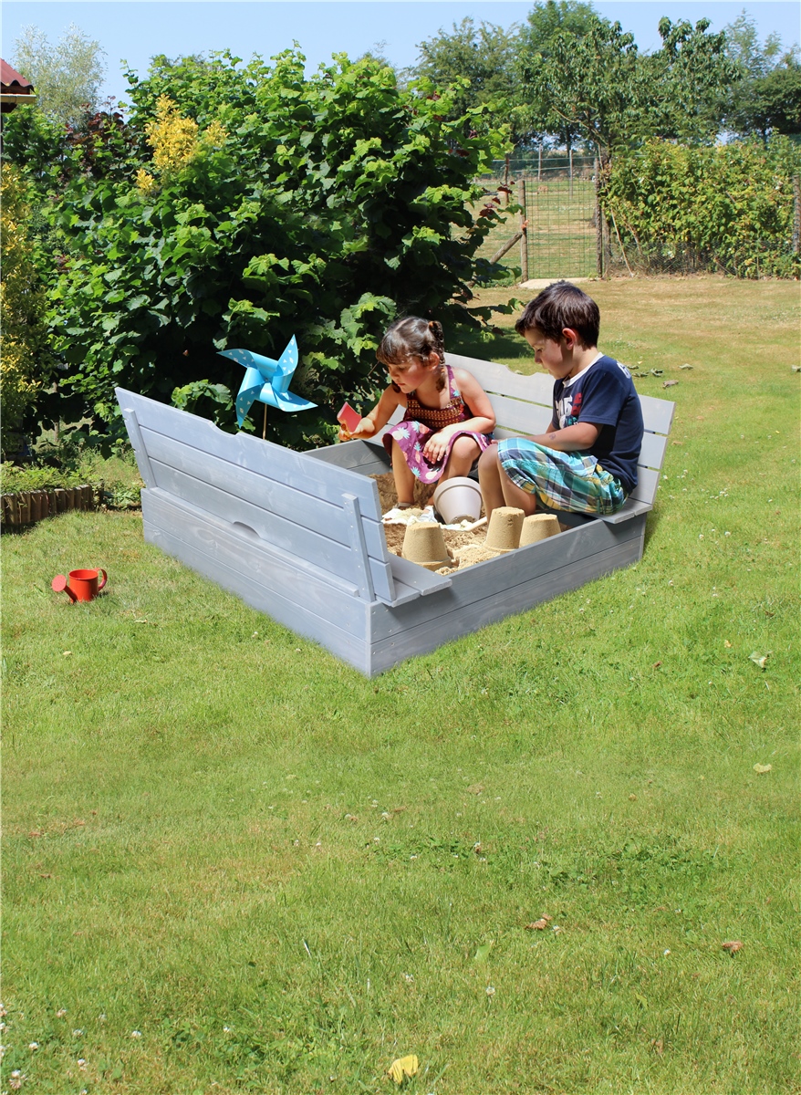 - Der Sandkasten wird aus getrocknetem und FSC zertifiziertem Kiefernholz