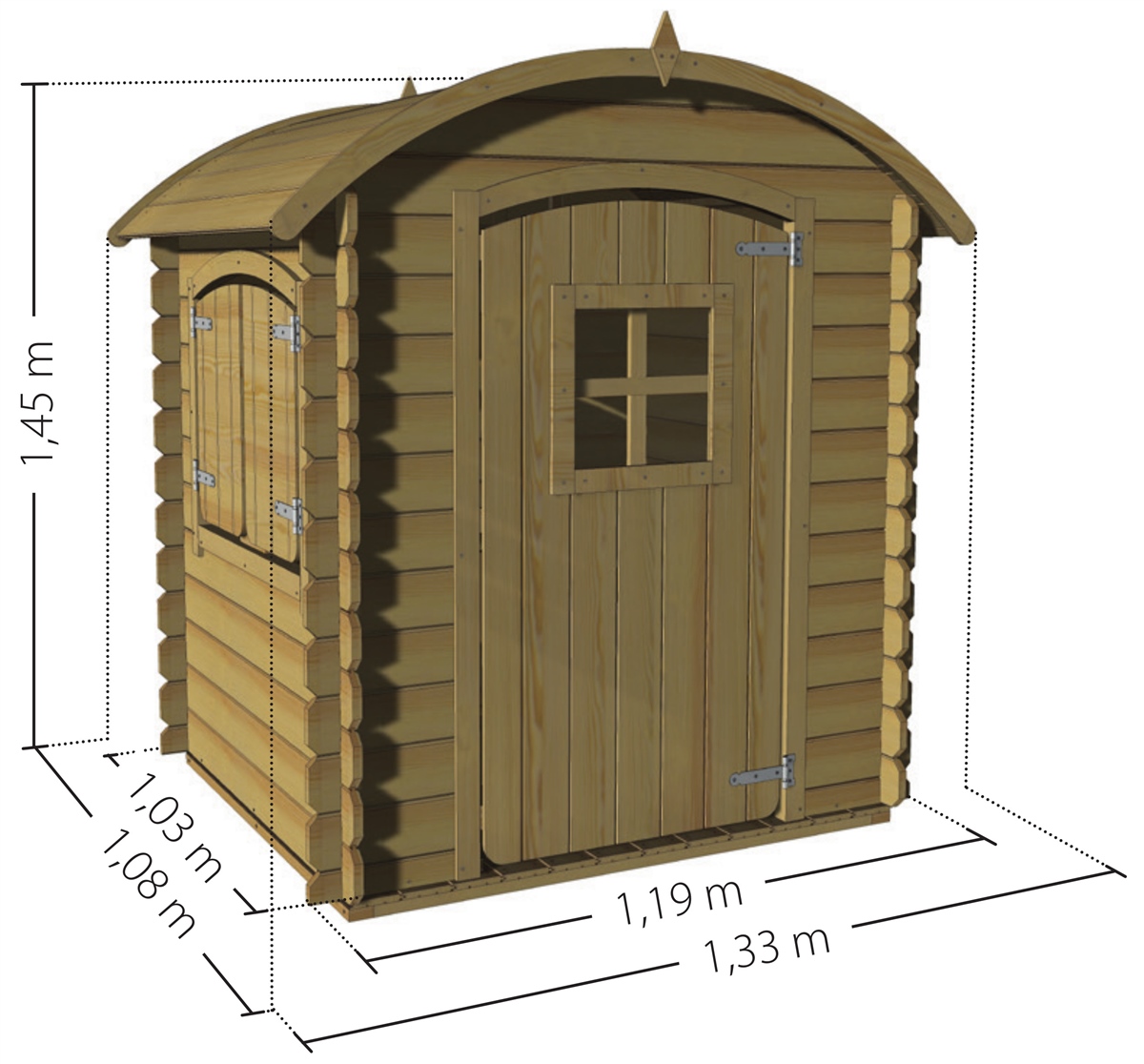 - Eine Tür und ein offenes, mit Fensterläden verschließbares Fenster ergänzen das Gesamtbild dieses Spielhauses.