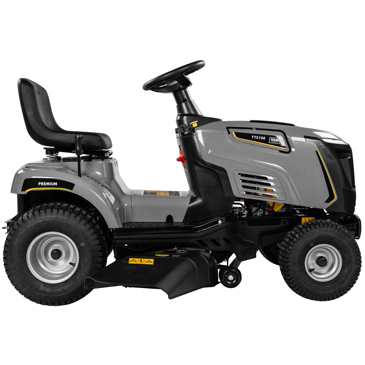 Der TEXAS Premium TTS108 ist ein umfangreich ausgestatteter Rasenmähtraktor. Seine große Schnittbreite von 108 cm macht ihn ideal für große Rasenflächen, ist aber mit seinen 45cm Radius sehr wendig. Der starke 432 ccm Motor bringt eine Leistung von 9200 Watt welche durch das 6-Gang Getriebe an das Mähmesser geleitet wird.